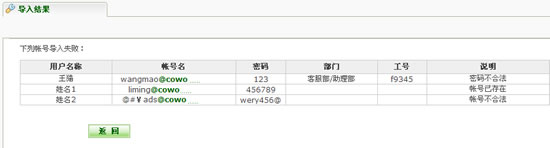 如果有部分帐号创建失败,系统将会显示出创建失败的帐号以及失败的原因。